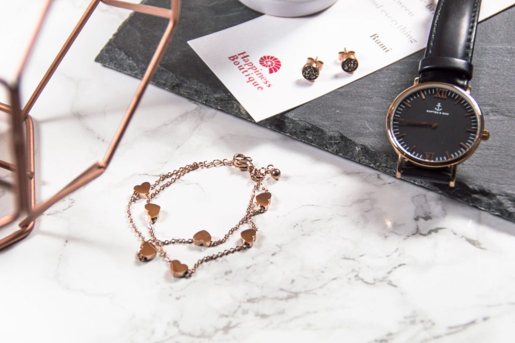 Es ist aus Titan gefertigt und rosé vergoldet, also absolut hautverträglich und robust. Ich trage es quasi ständig und es sieht immer noch aus wie neu – bisher ging mir das bei allen Schmuckstücken von Happiness Boutique so. Das Armband besteht aus zwei Reihen, in denen jeweils an unterschiedlichen Positionen kleine Herzen angebracht sind. Ich finde, es sieht besonders in Kombination mit einer dunklen Uhr hübsch aus, auf dem Bild trage ich eine von Kapten & Son.