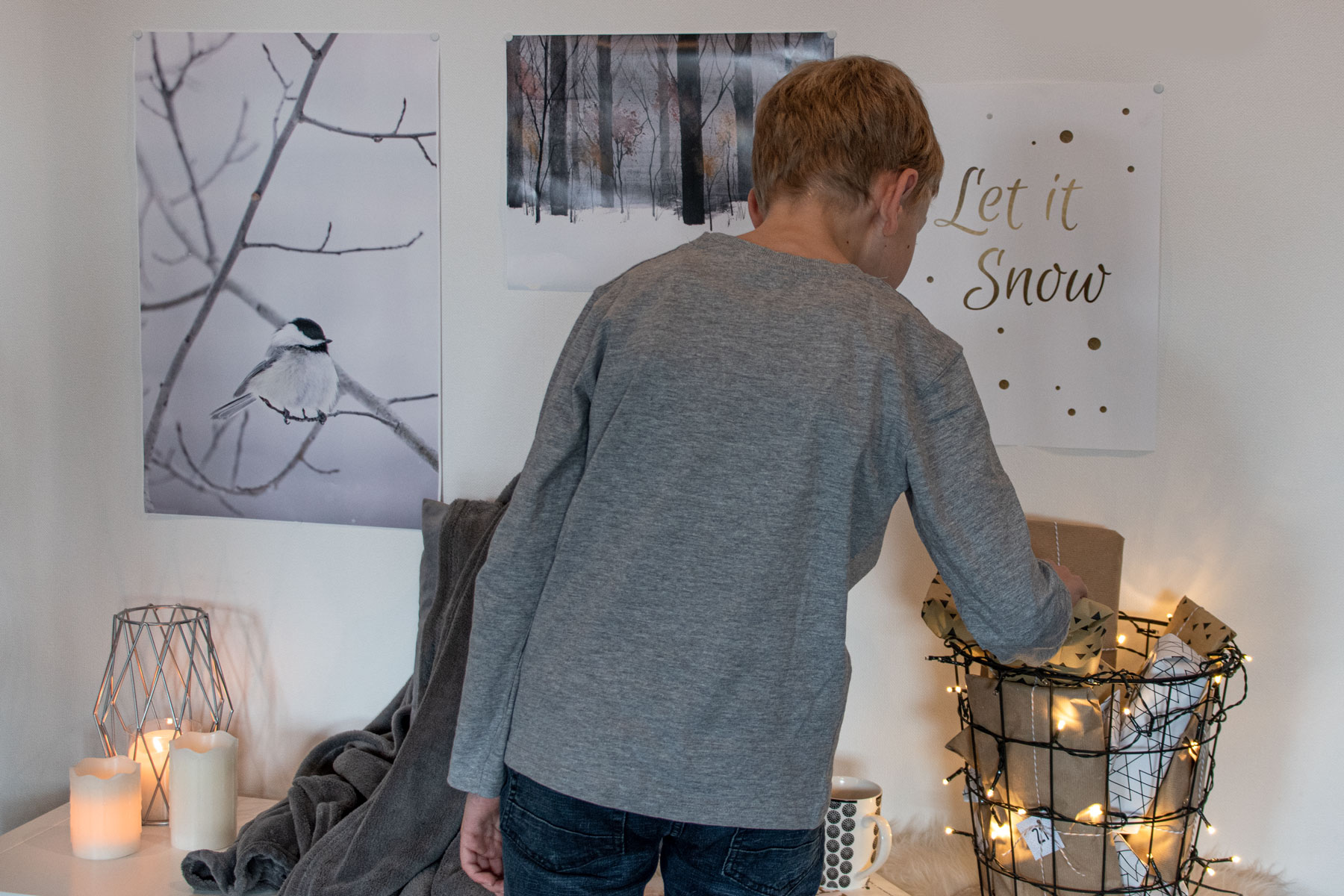 Die Poster von Posterlounge verleihen unserem Wohnzimmer eine angenehm warme und wohlige Atmosphäre. Wie ihr sehen könnt, habe ich auch unseren Adventskalender dort unter gebracht. Wie jedes Jahr bastel ich jenen selber und sammle das ganze Jahr über Ideen zum Befüllen. Zum Einpacken habe ich dann schlichtes Packpapier und Kordeln besorgt, eine Lichterkette um den Drahtkorb gewickelt und das ganze noch mit den passenden Nummern versehen. Mein Sohn jedenfalls ist schon sehr neugierig und kann es gar nicht abwarten, bis endlich der 1. Dezember ist. :-)